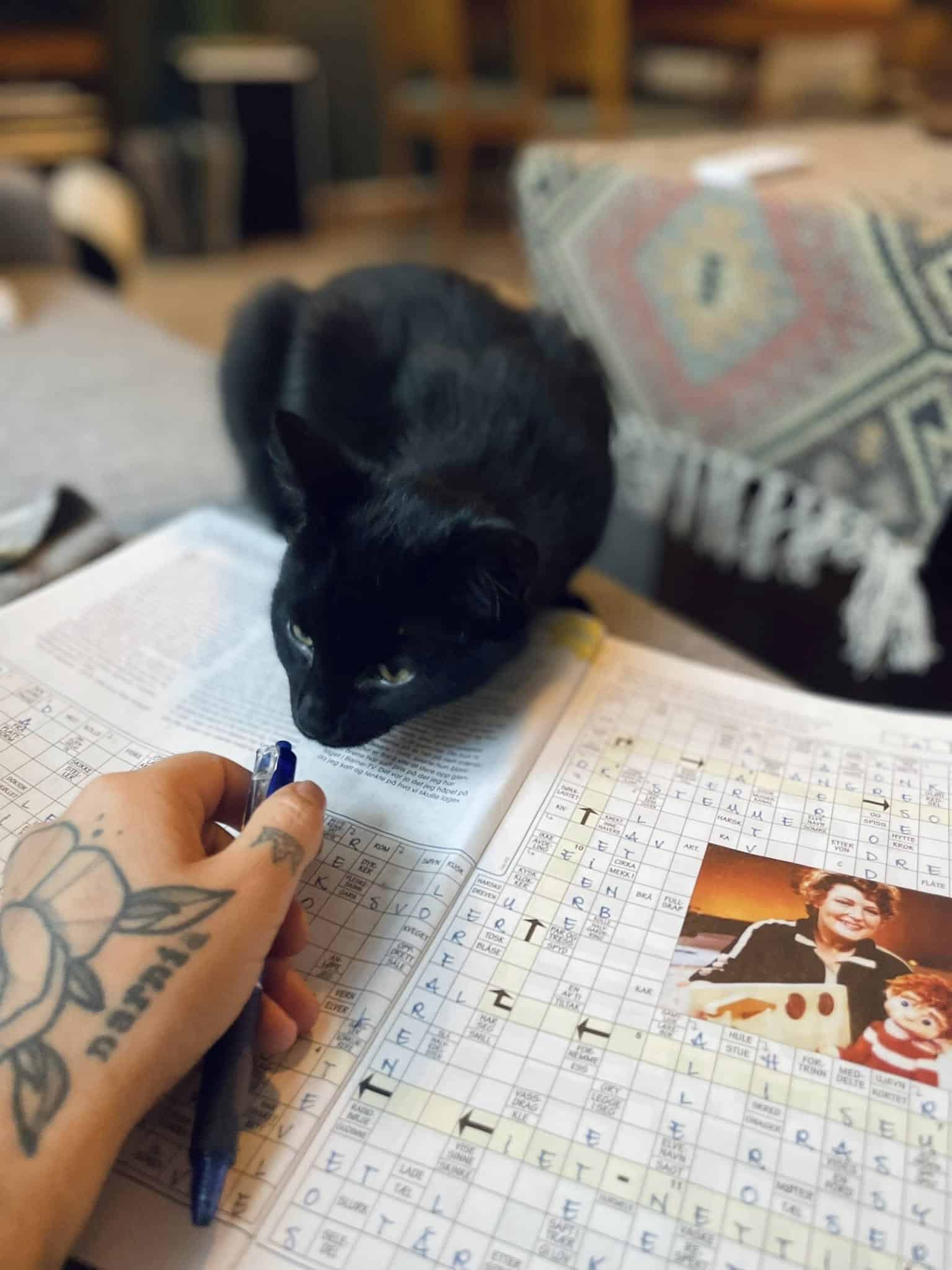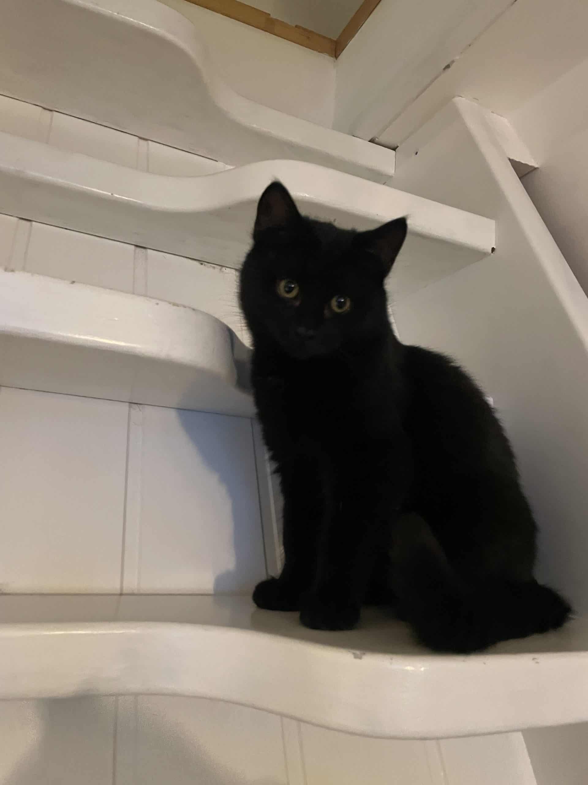 Fie er ei nydelig pusejente med kort sort pels og gule øyne.